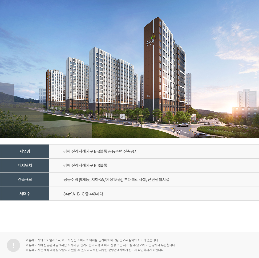 김해 테크노밸리 제일풍경채는 진례시례지구 B-3블록에 들어서는 총 440세대, 지하 3층~지상 15층 9개 동 규모의 중층 대단지입니다. 제2종 일반주거지역으로 계획돼 과밀하지 않게 설계됐고, 건폐율 약 20%대·용적률 약 180% 수준으로 조경과 동간 거리의 여유를 확보했습니다. 전용 84㎡ 단일 면적 체계지만 세부 유닛(A/B/C)으로 나눠 생활 패턴에 맞춘 선택이 가능합니다. 브랜드·규모·밀도의 균형이 김해 테크노밸리 제일풍경채의 첫인상을 결정합니다.