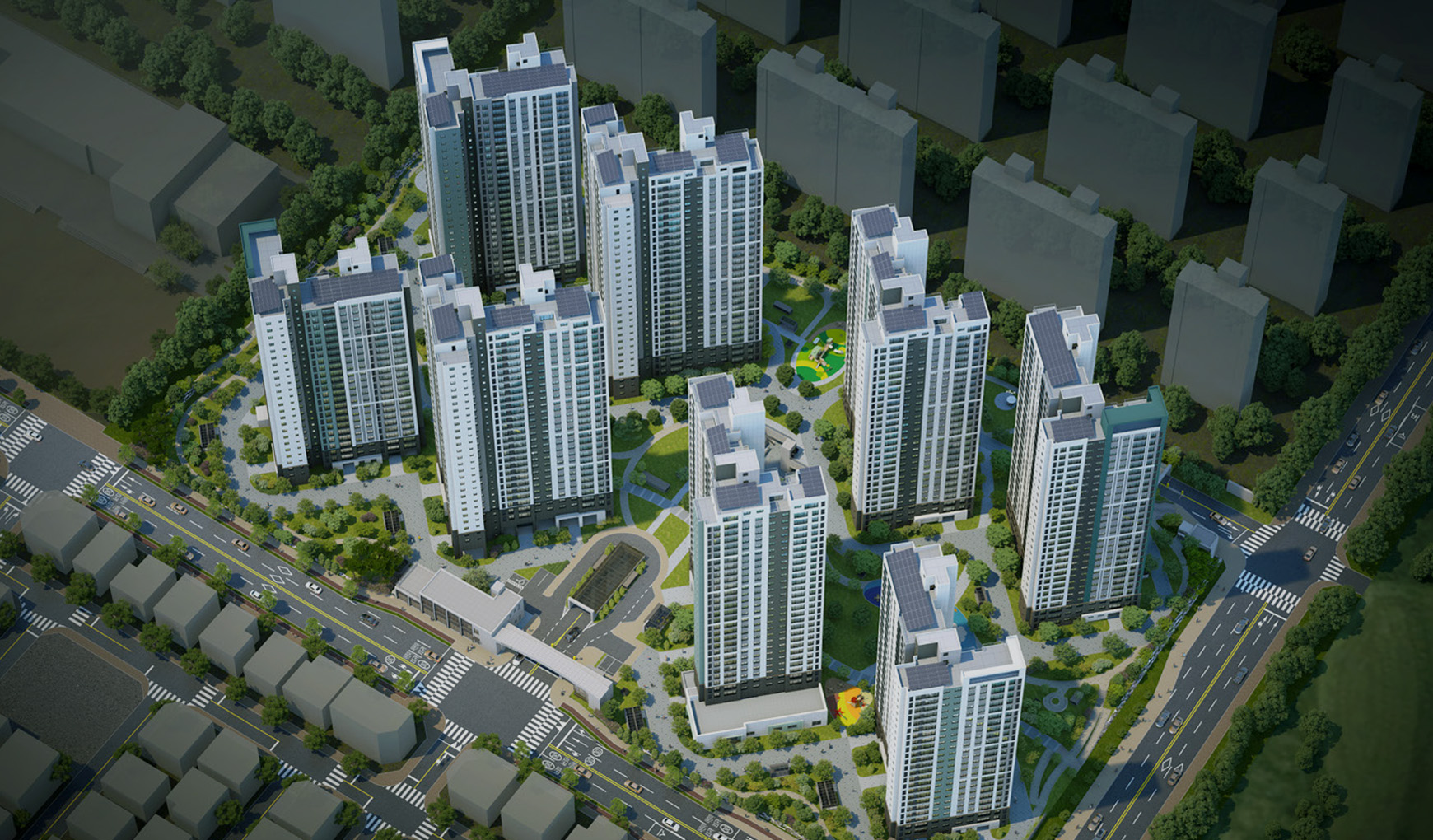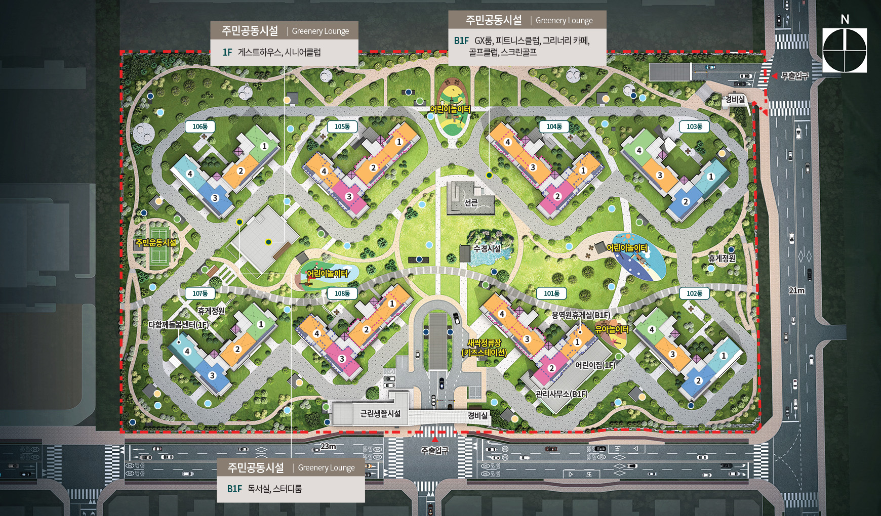 피트니스·GX·실내골프 등 액티브한 시설과 개인독서실·스터디룸·카페·게스트하우스를 아우르는 구성이 예고돼 있습니다. 낮은 건폐율을 활용해 잔디마당, 수경시설, 테마놀이터를 촘촘히 배치하고 지상 차량 동선을 최소화해 보행 안전과 휴식의 밀도를 높였습니다. 일괄제어, 원패스 출입, 공기질 관리 등 스마트 사양도 일상 편의에 집중한 구성이어야 합니다.