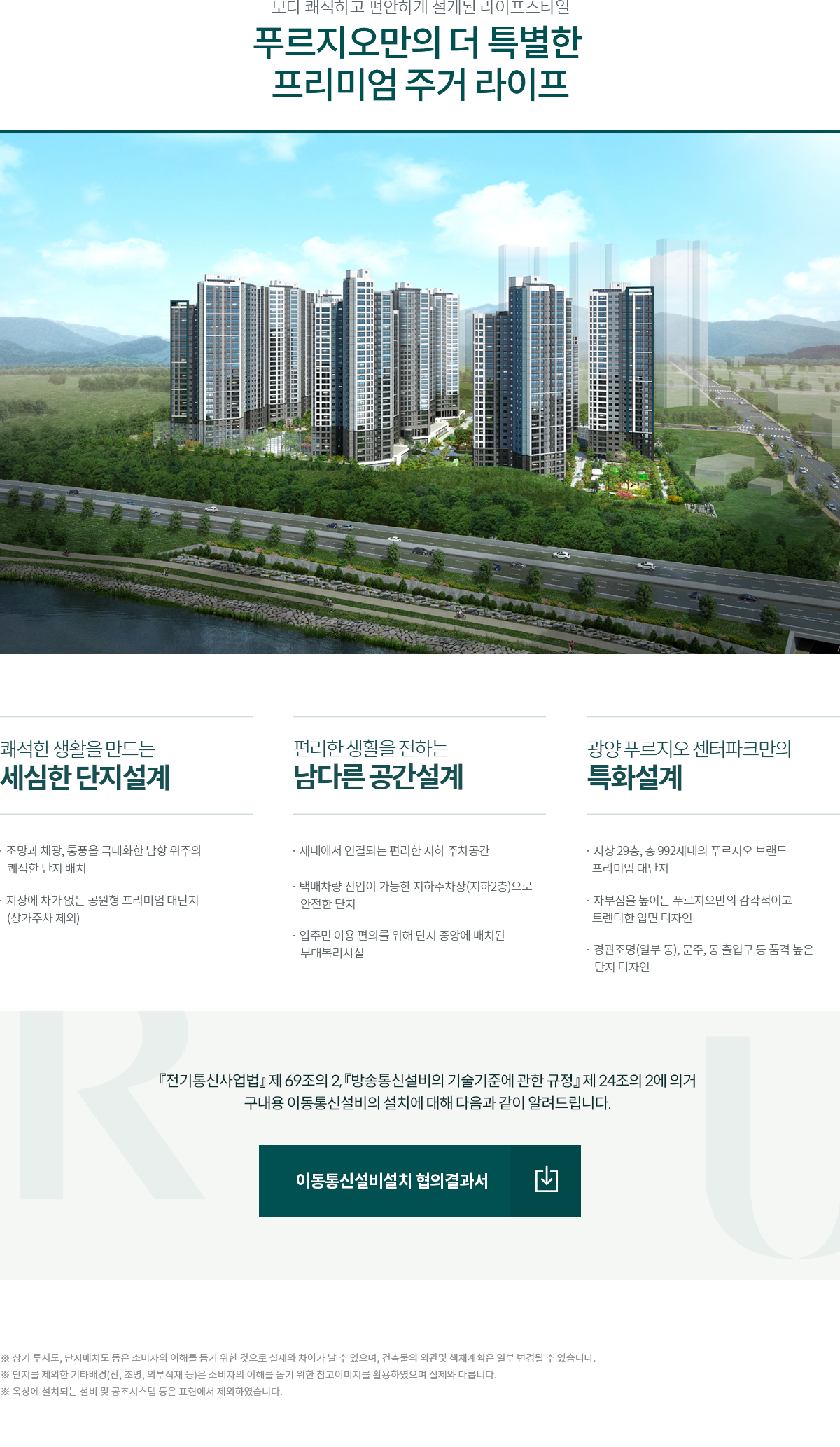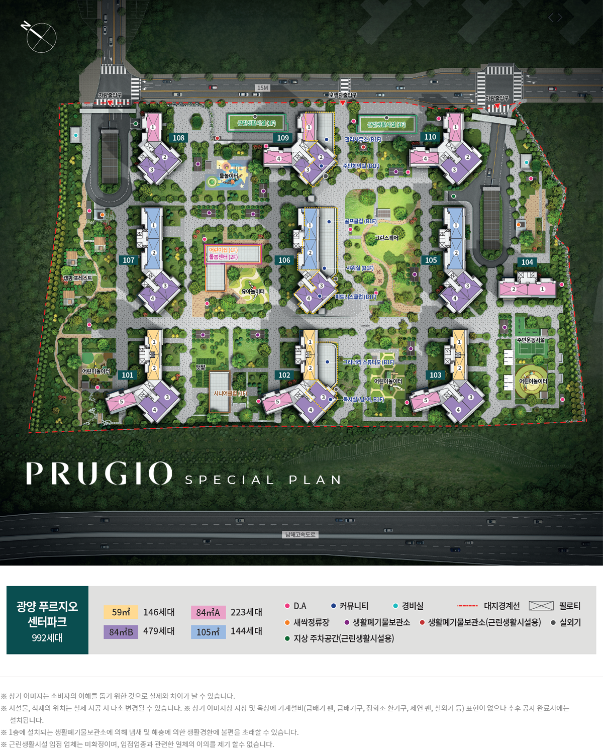 대상지는 광양시 용강리 산1-1번지 일원으로, 건폐율을 낮추고 동 간 이격을 넉넉히 확보한 점이 인상적입니다. 총 9개 동, 지하 주차를 기본으로 한 992세대 규모의 브랜드 대단지로 계획되어 스케일에서 오는 안정감이 확실합니다. 남향·정남향 위주의 배치와 최장 약 88m까지 벌린 동 간 거리 덕분에 사생활 보호와 통경축이 동시에 확보되도록 설계했습니다. 이 기본기만으로도 광양 푸르지오 센터파크가 가진 체감 쾌적성은 분명합니다.