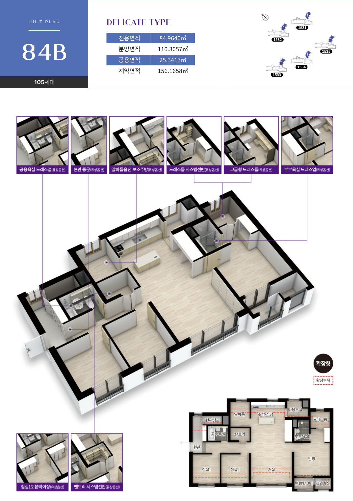 84A는 4베이 판상형에 맞통풍 구조, 거실·주방의 직관적인 동선이 강점입니다. 현관 창고와 주방 팬트리, 알파룸이 더해져 방 4개 활용이 가능하고, 드레스룸은 컴팩트하지만 수납 동선을 짜임새 있게 구성했습니다. 84B 역시 4베이에 알파룸을 포함한 방 4개 구성이 핵심입니다. 두 타입 모두 가족 구성 변화에 유연하며, 평택 고덕 금성백조 예미지는 같은 면적이라도 체감 공간을 넓히는 수납 특화가 돋보입니다.