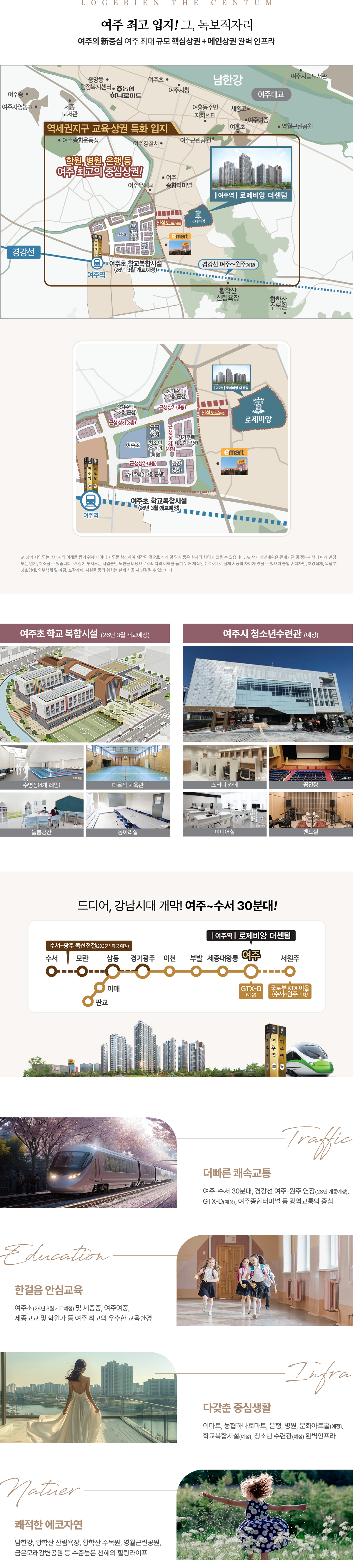 여흥초, 여주여중, 세종초·중·고가 반경 1km 내 밀집해 통학 동선이 짧습니다. 특히 2026년 3월 여주초 이전 예정으로 도보 통학 환경이 한층 좋아질 전망입니다. 남한강·황학산 산림욕장·수목원·영월근린공원·금은모래강변공원 등 녹지·수변 자원이 가까워 주말 힐링 루틴을 만들기 좋습니다. 학군과 자연의 균형은 여주역 로제비앙 더센텀의 장기 거주 매력을 높이는 요소입니다.