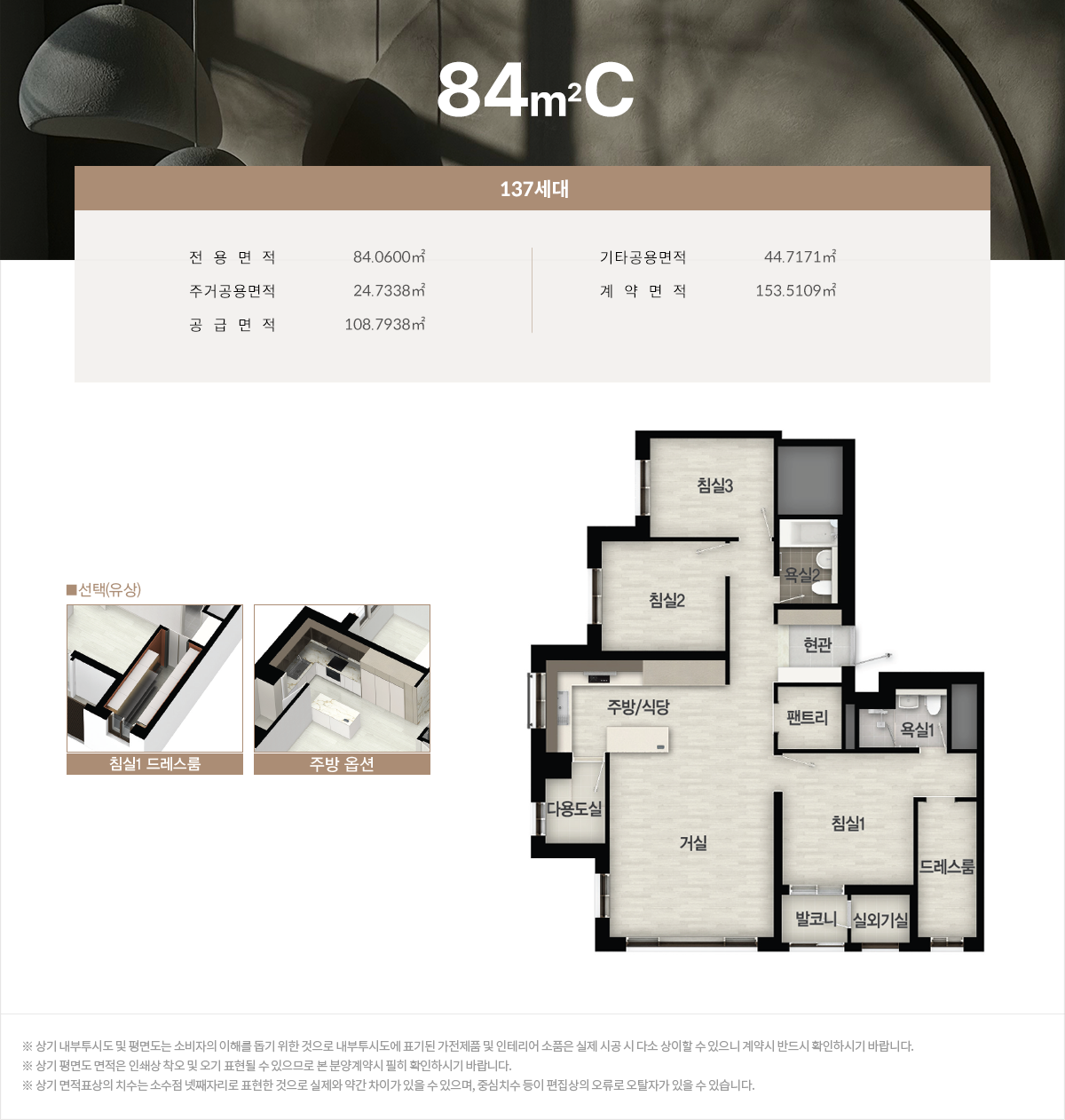 수요가 가장 두터운 전용 84㎡가 약 88%를 차지하며 A·B·C로 세분화되었습니다. 84A·84B는 판상형으로 맞통풍과 자연채광에 유리하고, 광폭 주방과 2.5m 층고가 개방감을 확장합니다. 84C는 타워형으로 이면창을 통해 채광을 강화하고 광폭 드레스룸·팬트리로 수납을 극대화했습니다. 중대형인 113·120㎡는 알파룸과 현관 창고, 오픈 발코니로 취미·재택·수납 활용도를 키웠고, 펜트하우스 160㎡는 4침실·2드레스룸·서재·2개 테라스로 하이엔드 라이프를 구현합니다. 실내 전 세대 유리 난간, 층간소음 저감 바닥, 전열교환 환기 등 쾌적성을 위한 기본기도 탄탄합니다. 여주역 로제비앙 더센텀이 상품성에서 한 발 앞선 이유입니다.