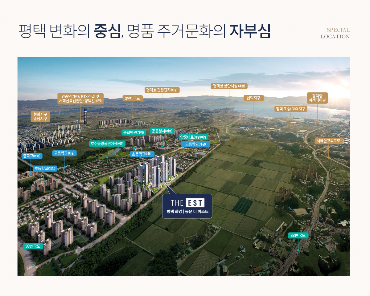 38번 국도와 서해안고속도로 접근성이 우수하고, 안중역 도보생활권이 가능한 자리입니다. 광역철도망 확충과 환승 편의 개선이 이어지면 서울권 이동 시간 단축이 기대됩니다. 산업단지 확장과 물류 동선 고도화가 병행되는 서평택의 흐름을 고려하면, 평택 화양 동문 디 이스트는 직주근접과 광역 접근성 두 축에서 성장 잠재력이 분명합니다.