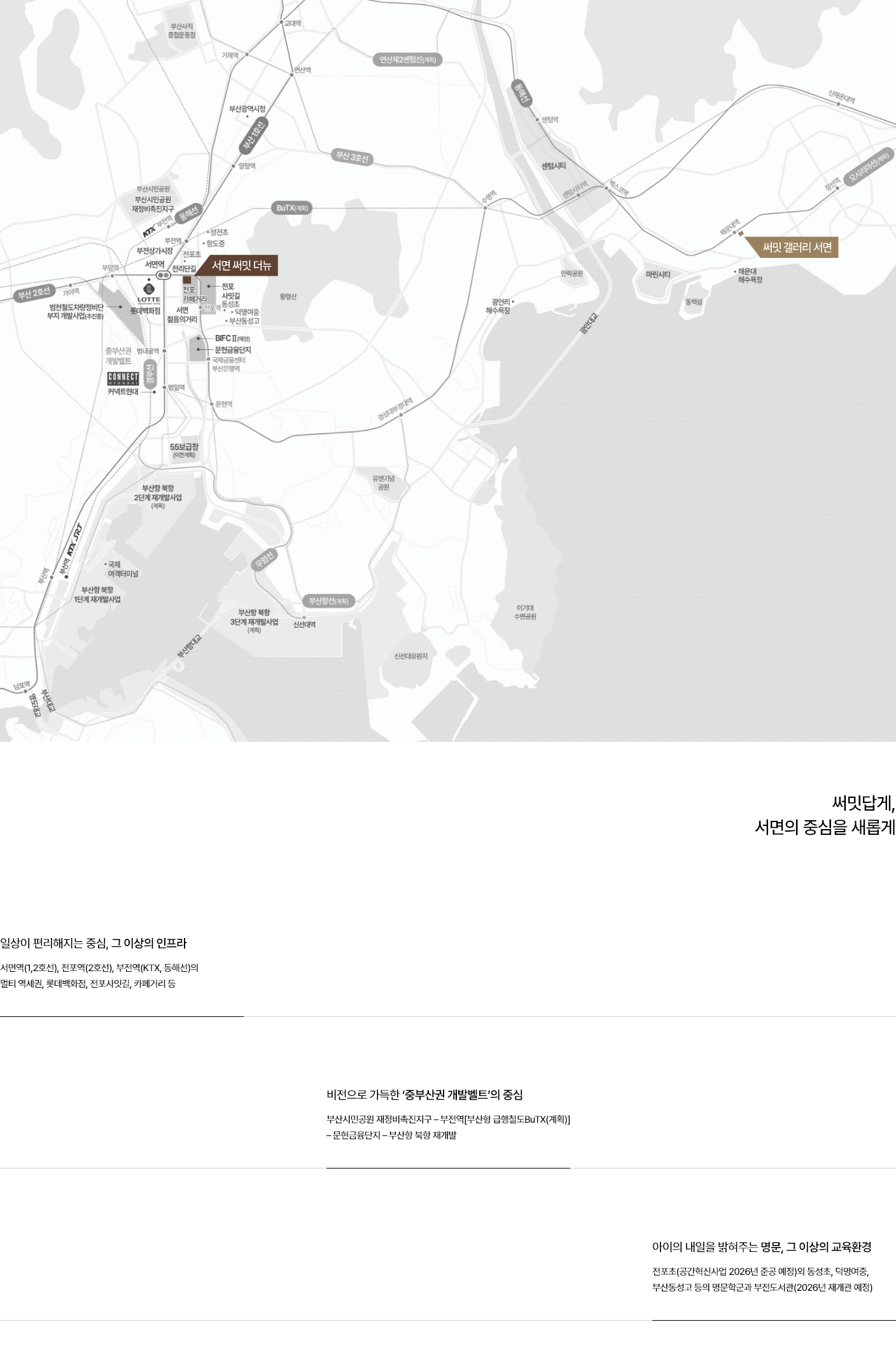 서면 써밋 더뉴의 최대 장점은 이동 효율입니다. 도시철도 1·2호선 더블 역세권을 중심으로 KTX와 급행철도 노선이 지나는 복합 환승 거점까지 가깝습니다. 업무지구, 대학가, 해운대·센텀과의 연결성이 뛰어나 출퇴근·외출 동선이 단순해집니다. 롯데·NC 리테일 자산, 로데오 상권, 대형 문화·쇼핑시설, 각종 메디컬센터가 척척 이어지고, 부산시민공원·송상현광장 등 녹지까지 도보 접근이 가능합니다. 초·중·고 및 학원가로 이어지는 학령 12년 체계 또한 인접해 학부모 수요의 선호가 높습니다. 이런 입지적 밸류는 서면 써밋 더뉴가 장기 보유 관점에서도 이유 있는 선택이 되는 배경입니다.
