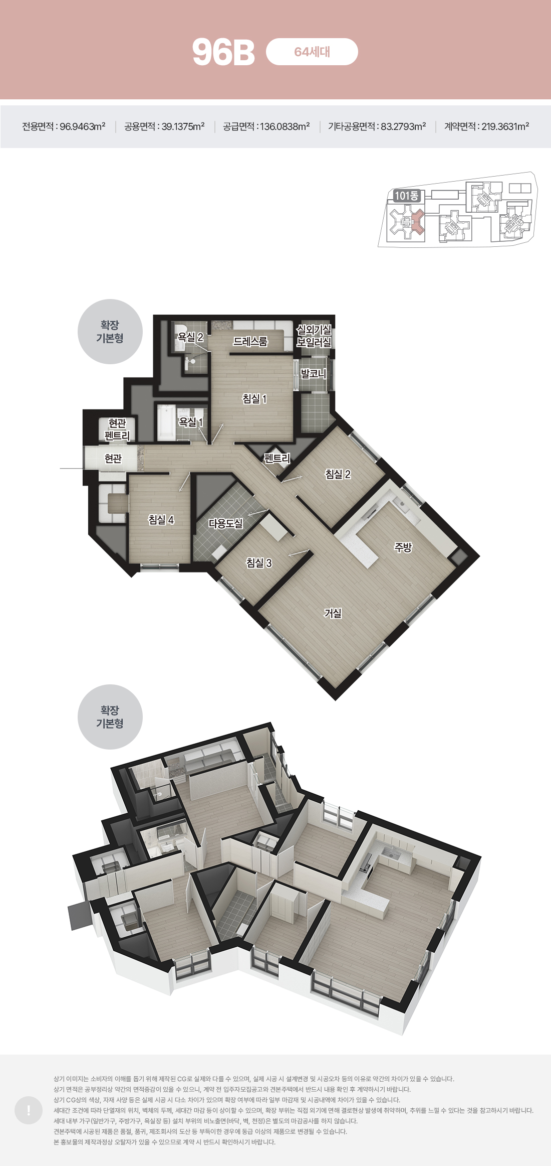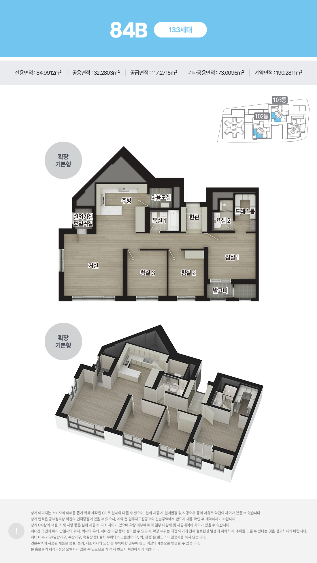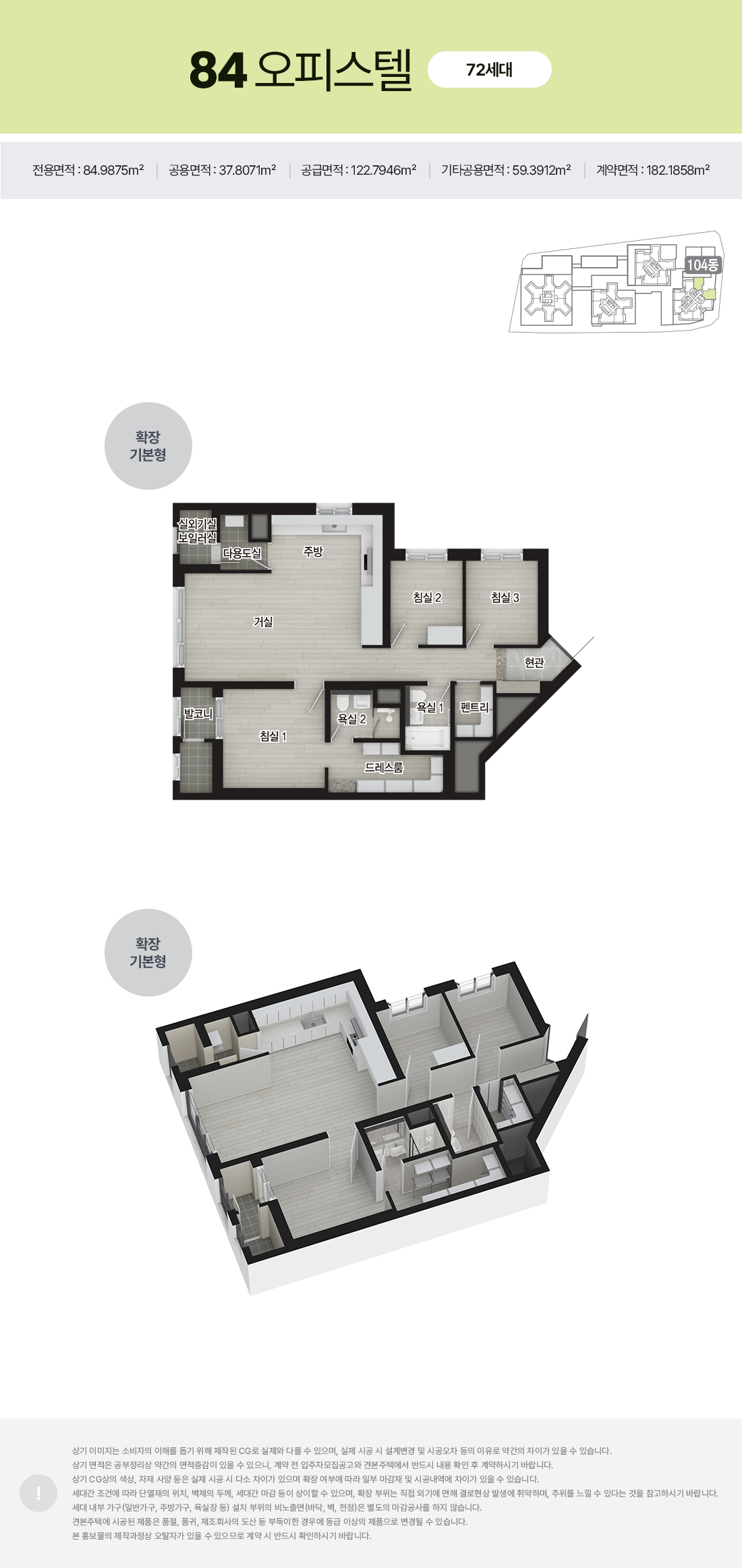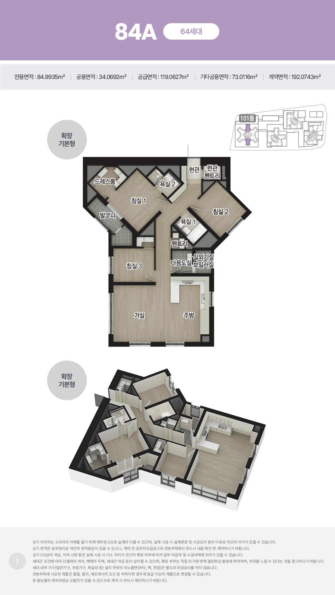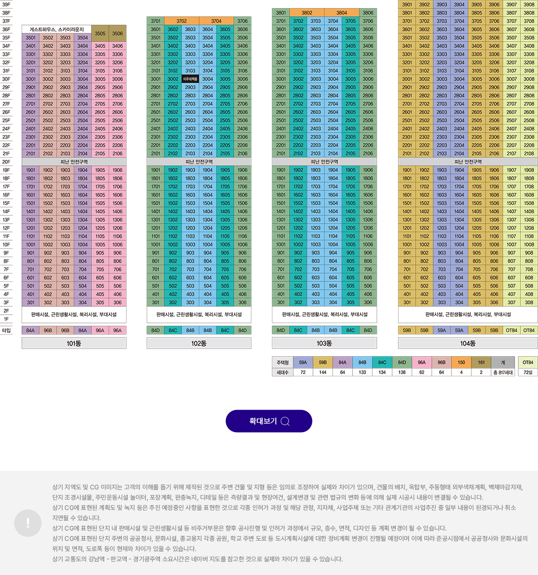 주력형은 전용 59·84·96㎡이며, 펜트 150·161㎡로 대형 수요도 대응합니다. 84A는 이면 개방형 거실로 채광·통풍을 극대화했고, 팬트리·드레스룸·다용도실로 수납 동선을 정리했습니다. 84B는 4베이 판상형으로 동선이 단순하며, 84C는 타워형 구성으로 공간 분리에 강점이 있습니다. 전반적으로 해링턴스퀘어 리버파크는 “광폭 거실+수납 특화”라는 최근 트렌드를 성실히 반영해 가족 구성 변화에도 유연하게 대응합니다.