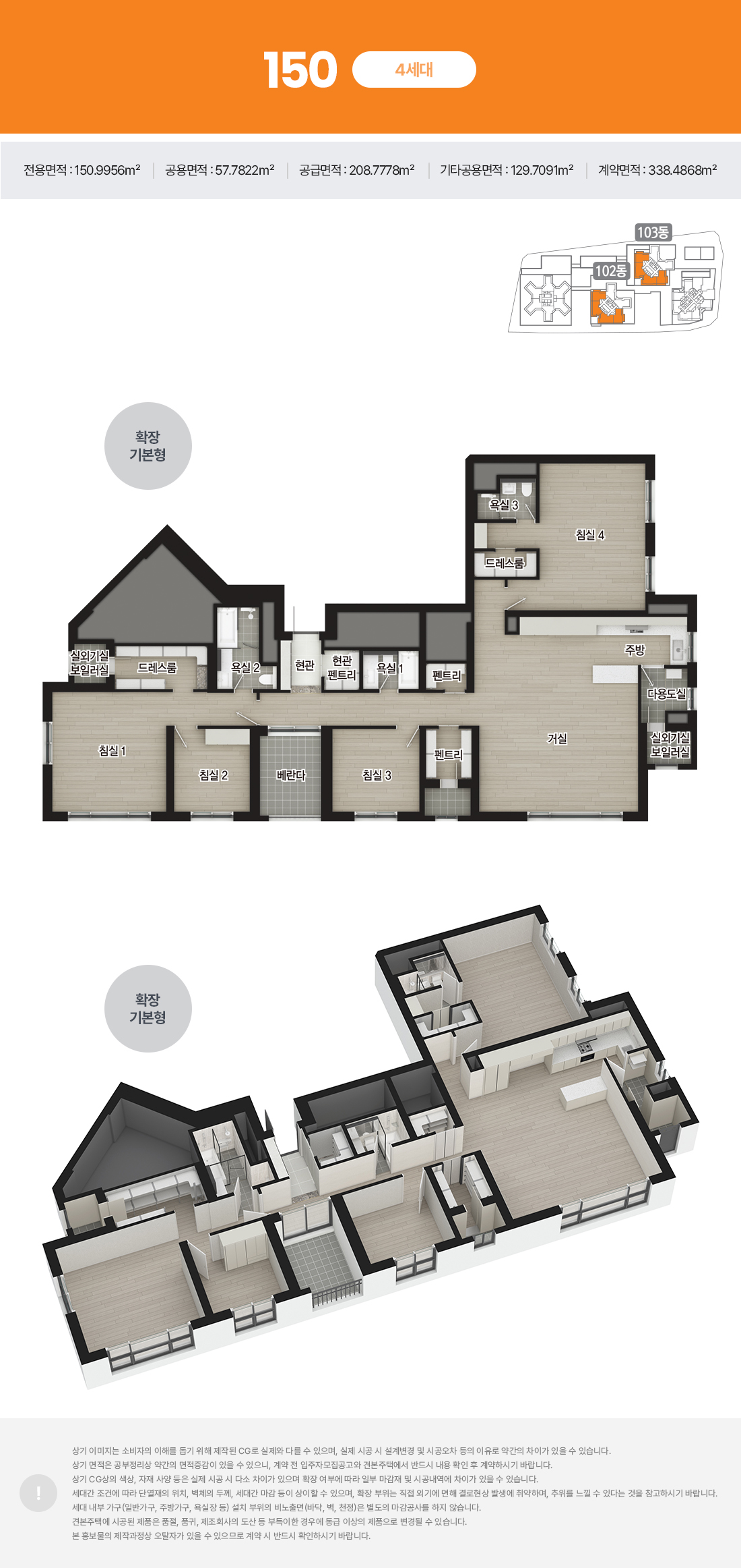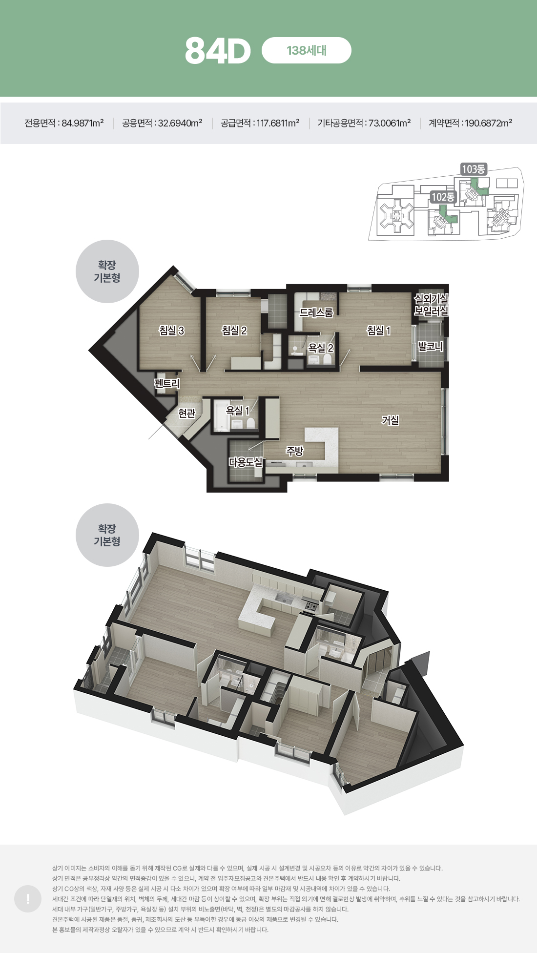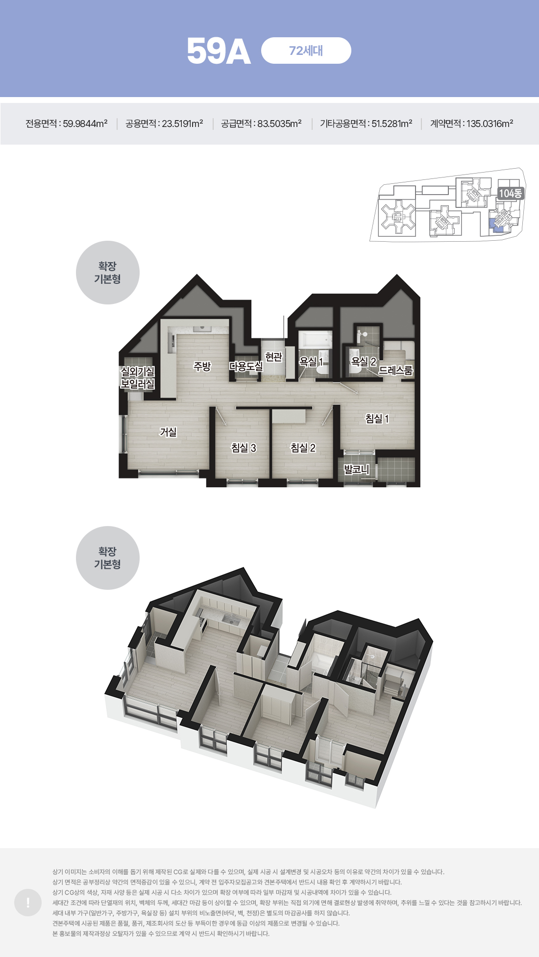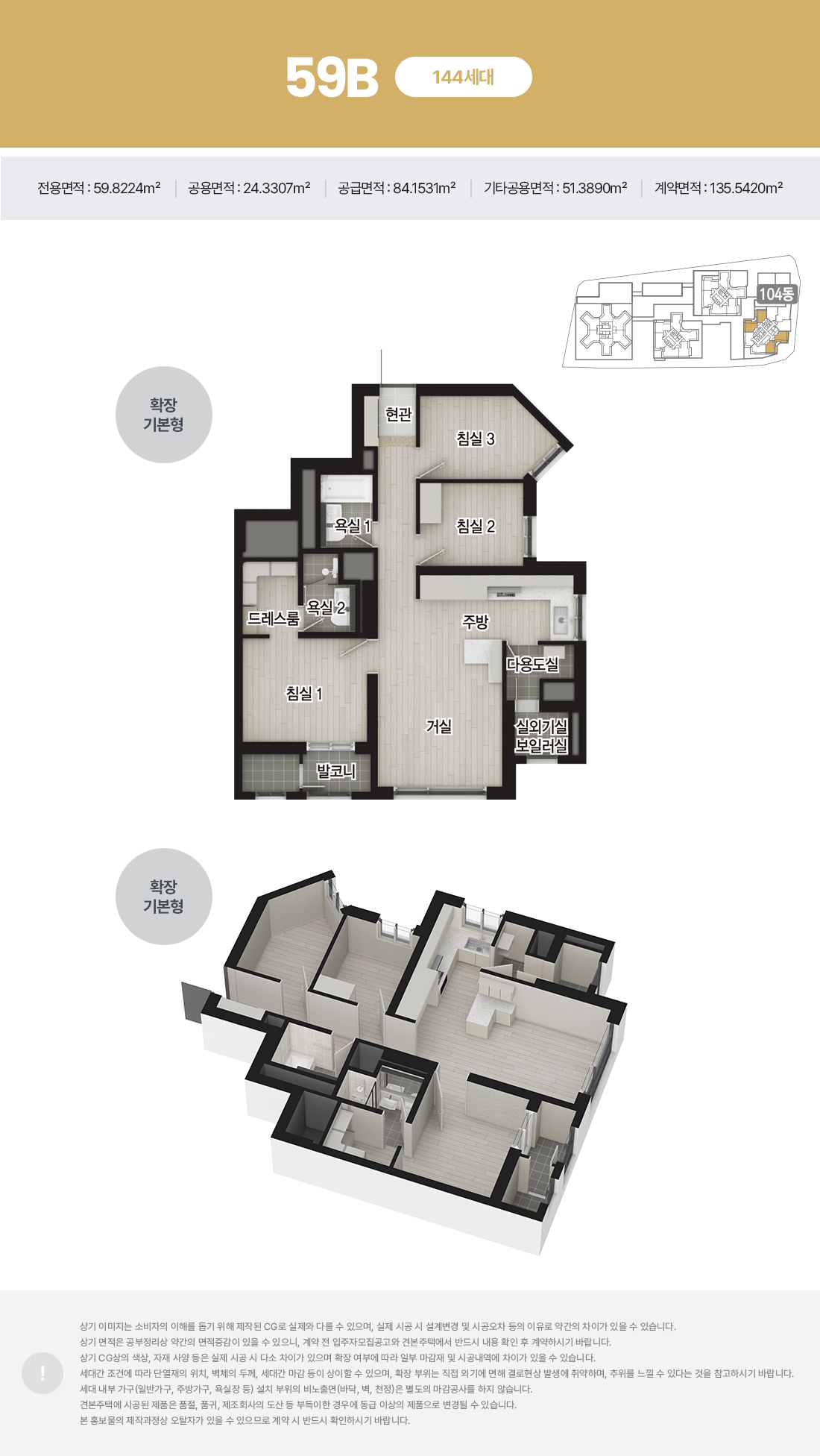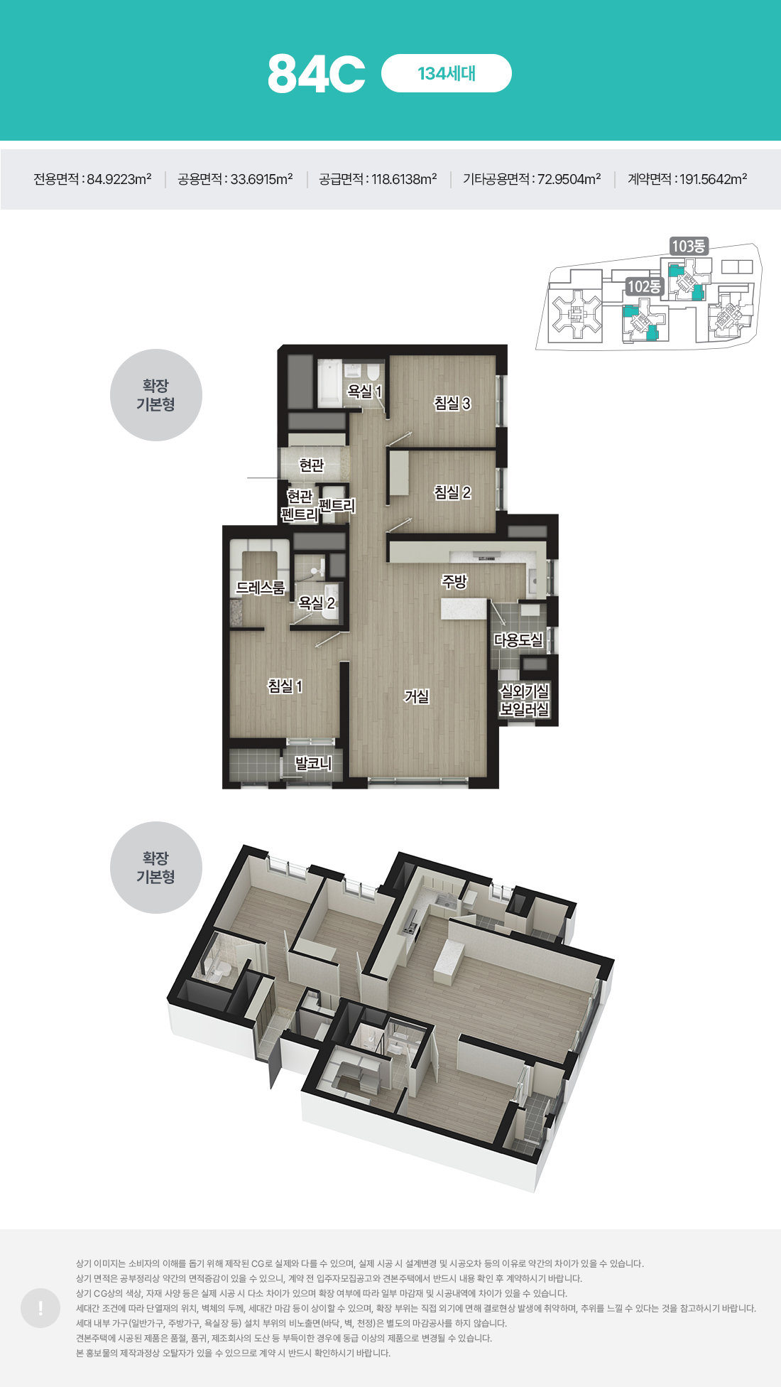 주력형은 전용 59·84·96㎡이며, 펜트 150·161㎡로 대형 수요도 대응합니다. 84A는 이면 개방형 거실로 채광·통풍을 극대화했고, 팬트리·드레스룸·다용도실로 수납 동선을 정리했습니다. 84B는 4베이 판상형으로 동선이 단순하며, 84C는 타워형 구성으로 공간 분리에 강점이 있습니다. 전반적으로 해링턴스퀘어 리버파크는 “광폭 거실+수납 특화”라는 최근 트렌드를 성실히 반영해 가족 구성 변화에도 유연하게 대응합니다.