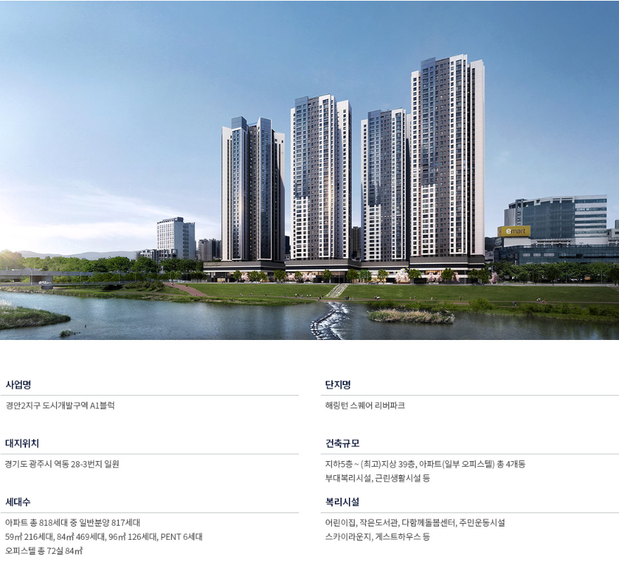 해링턴스퀘어 리버파크는 경기도 광주시 역동 28-3 일원에 조성되는 주거복합 단지로, 지하 5층에서 지상 39층까지 4개 동, 아파트 818세대와 오피스텔 72실로 구성됩니다. 주차는 가구당 약 1.39대 수준을 확보해 피크 타임에도 비교적 여유로운 동선을 기대할 수 있습니다. 대지·연면적 대비 높은 사업 효율과 지역 최고층급 스카이라인이 결합되어 상징성과 희소성이 동시에 부각됩니다.