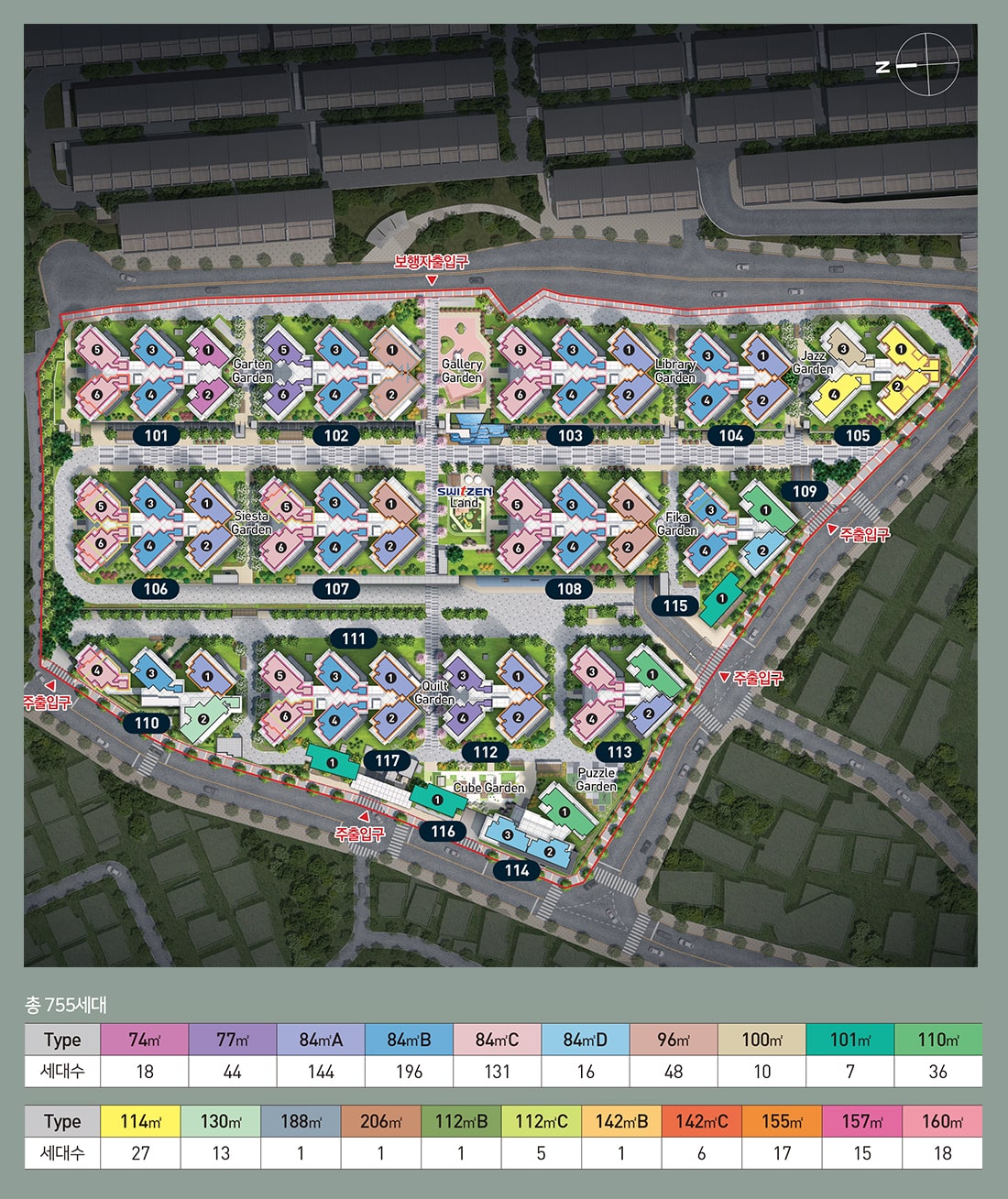 수성 포레스트 스위첸의 주소지는 대구 수성구 파동 118-118번지 외 284필지 일원입니다. 건폐율 약 30.46%, 용적률 약 240.28%로 설계되어 과밀하지 않은 밀도에서 조경과 동간거리를 확보했습니다. 전체 15층 이하의 수평적인 스카이라인은 저층 세대에서도 조망과 채광을 누리기 쉽게 해주며, 단지 중앙부의 2개 통경축은 산책 동선과 바람길을 겸하여 쾌적성을 높입니다. 전용면적은 74~157㎡(일부 홍보물에는 74~206㎡로 제시)까지 폭넓고, **85㎡ 초과 대형 평형 비중이 약 27%**라 중대형 선호 수요를 적극적으로 겨냥합니다. 생활동선이 짧고, 집 안과 단지 녹지가 자연스럽게 닿는 구조는 수성 포레스트 스위첸의 핵심 기획입니다.